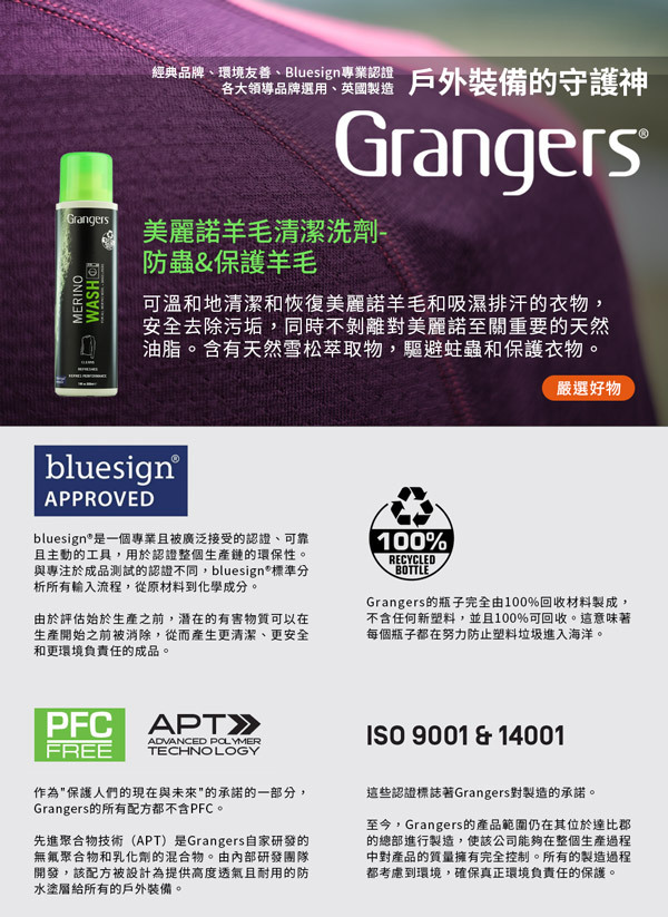 【Grangers 戶外裝備的守護神】創立超過85年,經典防潑水與清潔洗劑專業品牌。獲英國軍方使用與人類首次登頂珠穆朗瑪峰使用品牌。全球首位獲得bluesign認證的洗劑品牌,從生產原料、生產過程、化學成分、都通過嚴格的環保標準。工廠獲得ISO9001 & 140001標準認證,在製程品質的確保和環境保護都得到保證。100%海洋廢棄塑料再製瓶子包裝,補充包設計,積極減少廢棄物。水性產品,不含PFC(氟碳化合物),對環境與健康友善。深得戶外服飾領導品牌所使用。