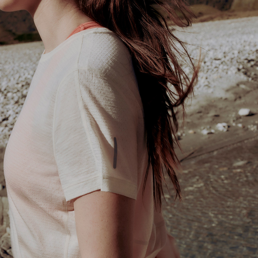 150 g/m²輕量布料使用,獨家Cool-Lite™清涼紗科技,將來自天然的動植物纖維做結合,將羊毛與萊賽爾(天絲)纖維親膚、透氣的特性發揮極致!局部網眼布料應用,打造出最輕量、透氣的短袖上衣,適合高強度運動中使用!