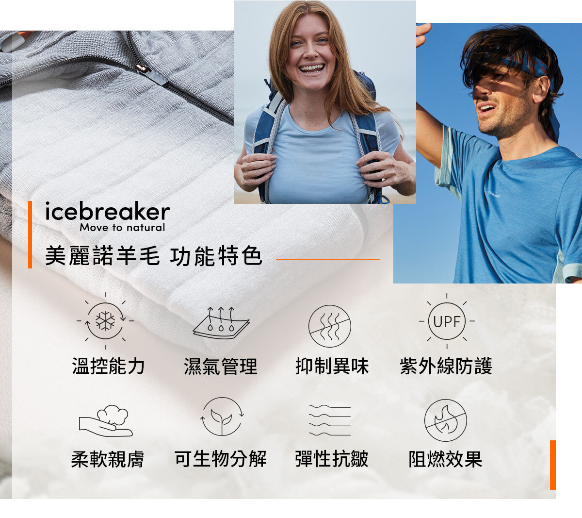 icebreaker 美麗諾羊毛的八大優點:溫控能力 、濕氣管理、抑制異味 、紫外線防護 、可生物分解 、彈性抗皺 、阻燃效果 。