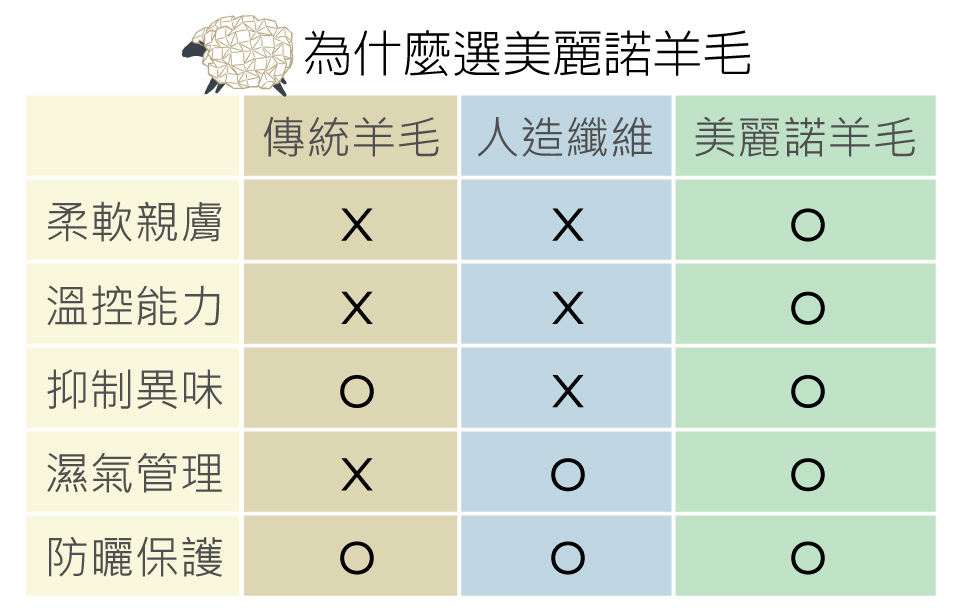 來自紐西蘭的 icebreaker 的美麗諾羊跟一般綿羊不同,他們住在高海拔的紐西蘭南阿爾卑斯山頂,正是因為高海拔的環境才使得美麗諾羊毛又細又柔軟,可是一旦超過6歲,美麗諾羊就無法繼續在高海拔山區生活,自然而然,羊毛的品質就跟著下降了。所以 icebreaker 堅持只使用高海拔美麗諾羊毛,一隻icebreaker 美麗諾羊一年約製造出五件磅數200的上衣(等於一輩子只能生產珍貴的三十件服飾)。就是因為如此執著於品質,icebreaker 的產品不但透氣性佳,還能夠適時調節體溫防止失溫;而不同於傳統羊毛的纖維尺寸,纖細的美麗諾羊毛讓衣服重量更輕了,刺癢的感覺也不見了!