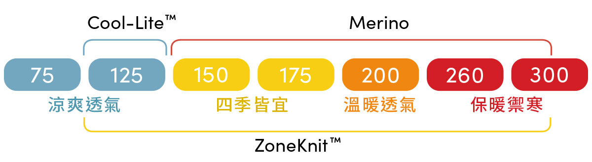 (此為icebreaker保暖度標示參考,非產品布料重量標示;溫度感受會因所處環境濕度、風速、本身攝取熱量多寡等因素影響而有不同,請參考服飾中文品名中的數字呈現。)