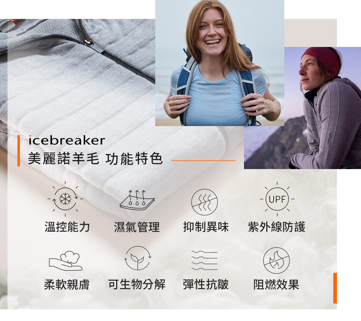 icebreaker 美麗諾羊毛的八大優點:溫控能力 、濕氣管理、抑制異味 、紫外線防護 、可生物分解 、彈性抗皺 、阻燃效果